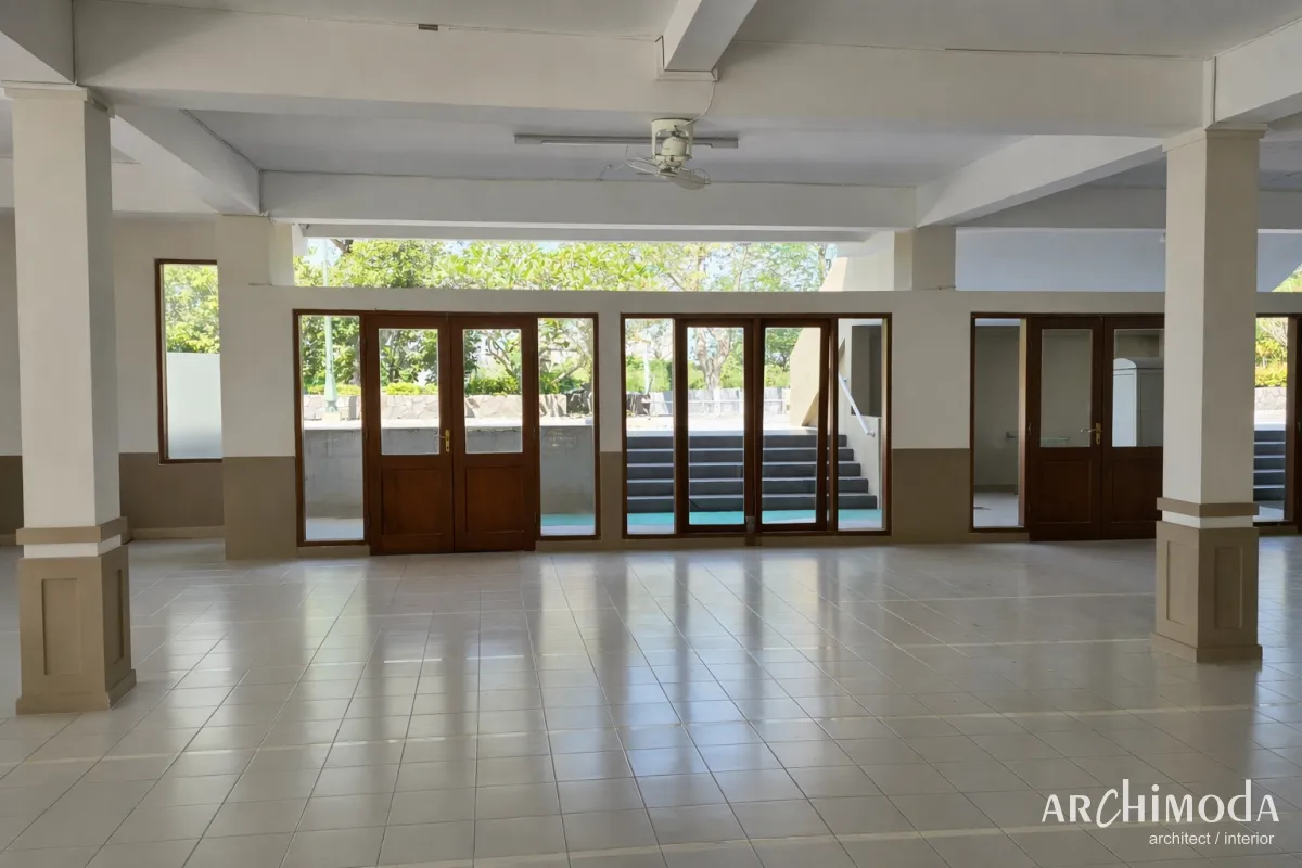 Desain interior Masjid Citraland Surabaya oleh Archimoda. Mengusung konsep minimalis modern dengan aksen kayu yang hangat dan pencahayaan yang tenang, menciptakan ruang ibadah komunal yang bersih, nyaman, dan khidmat.
