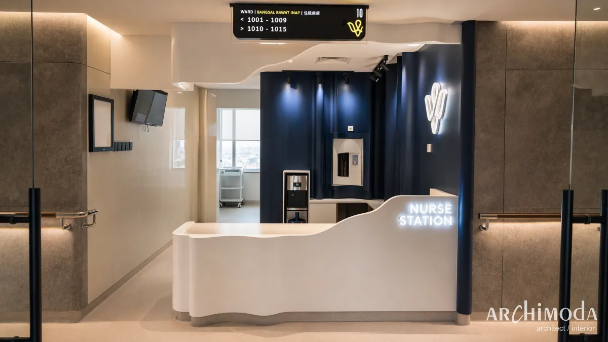 menampilkan interior rumah sakit modern dengan desain premium, meliputi area nurse station dan resepsionis yang minimalis, kamar pasien yang nyaman dengan fasilitas lengkap dan pencahayaan hangat, ruang keluarga/pantry kecil, koridor yang bersih dan elegan, serta ruang khusus seperti area bermain anak bertema laut; keseluruhannya didominasi material kayu, warna netral, dan pencahayaan lembut yang menciptakan suasana tenang, bersih, dan ramah bagi pasien maupun pengunjung.